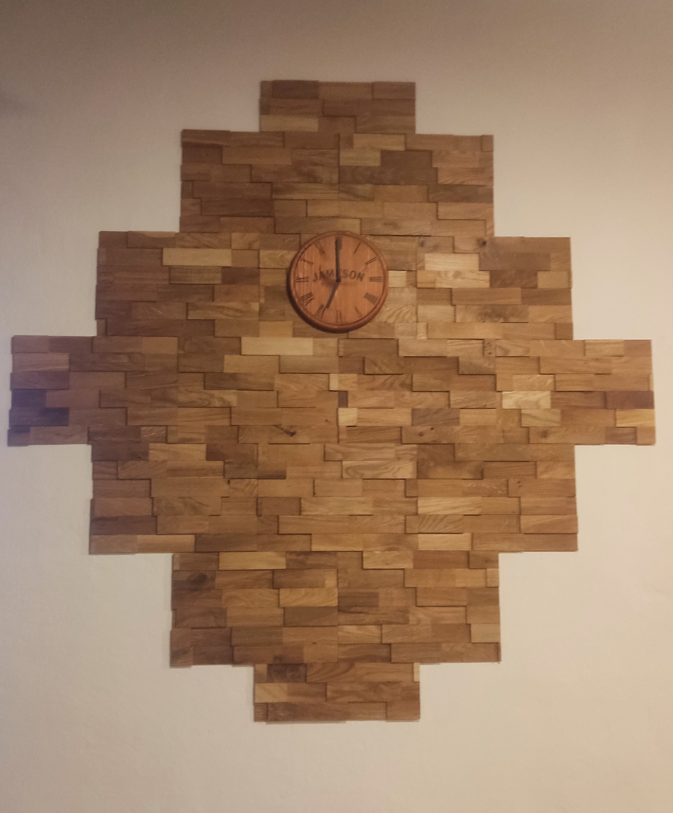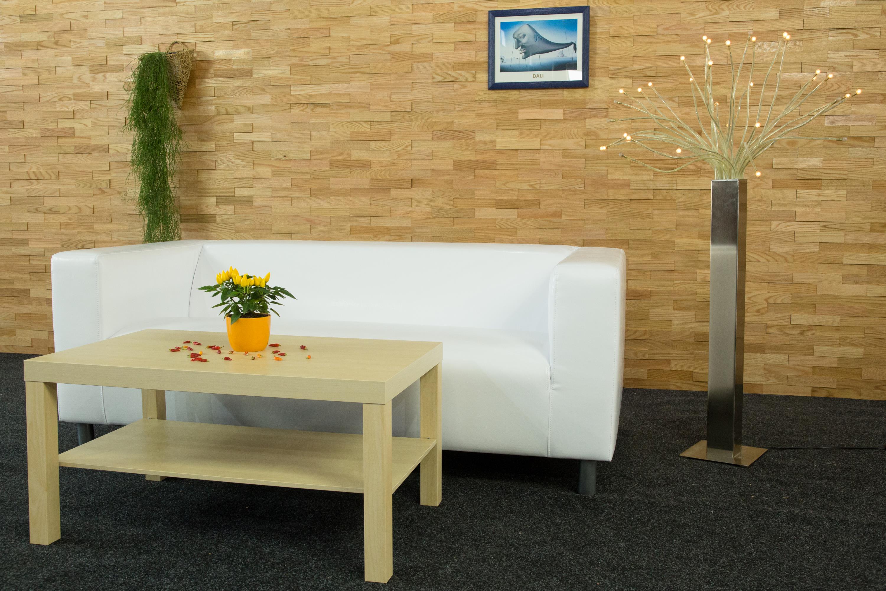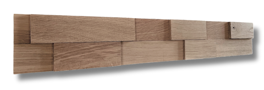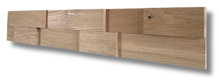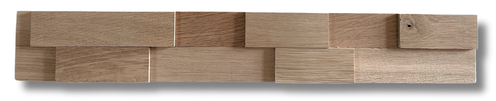 Obkladový panel z dubových lamel ve dvou řadách, v různých tloušťkách a délkách. Výrazný 3D efekt. Velmi lehký výrobek z kvalitního masívního dubového materiálu. Vhodný jako obkladový prvek do interiéru. Povrchově neošetřený.