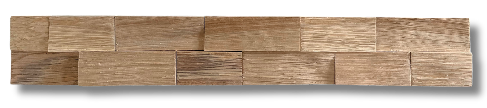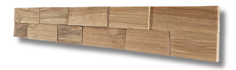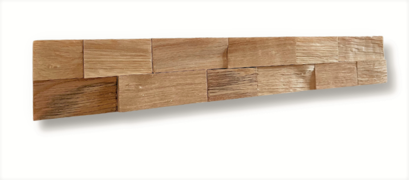 Obkladový panel ze štípaných dubových lamel ve dvou řadách, v různých tloušťkách a délkách. Výrazný 3D efekt. Velmi lehký výrobek z kvalitního masívního dubového materiálu. Vhodný jako obkladový prvek do interiéru. Povrchově neošetřený.